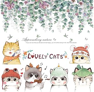 Suprosper ウォールステッカー 猫 葉 緑 おしゃれ 30*90cm 4枚 賃貸でもOK 壁紙シール ウォールシール 剥がせる インテリア 壁飾り (緑葉 猫)